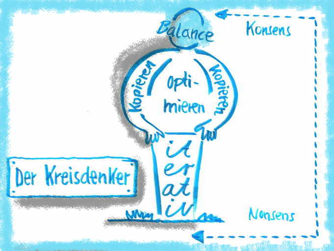 Auch hier wird gezeichnet, zusammengefasst und Kernpunkte ermittelt. Das kann auf einem „Big Paper” passieren, genauso häufig protokolliert man auch per Sketch Noting im Normal-Format am Tisch. Entscheidend für das Gelingen ist eine gute Absprache mit dem Moderator über Vorgehen, Zielsetzung und erwünschte Ergebnisse.